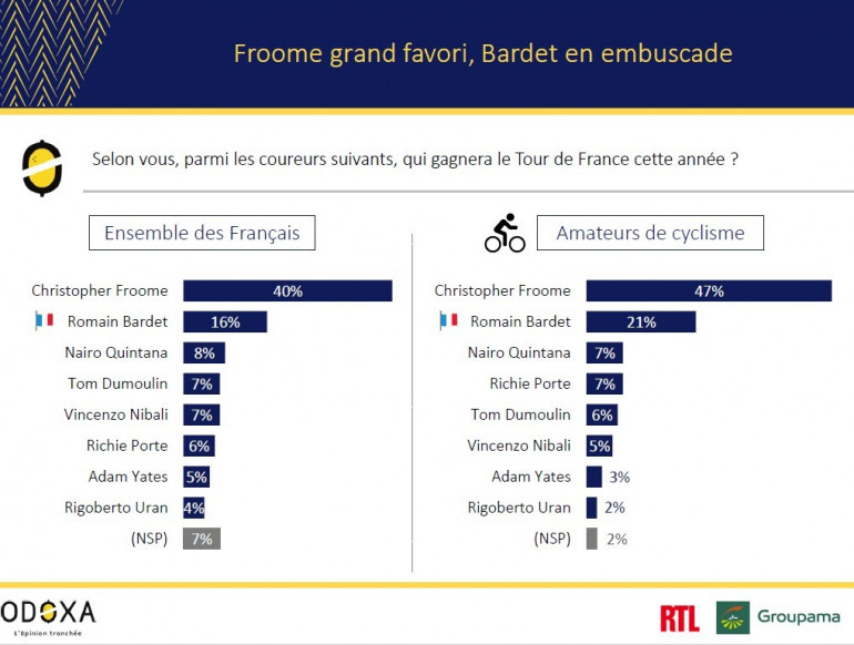 Romain Bardet se hisse à la deuxième place des favoris du Tour. Cité par 16% des Français et 21% des amateurs de cyclisme, le Français devance le Colombien Nairo Quintana, le Hollandais Tom Dumoulin, l'Italien Vincenzo Nibali, l'Australien Richie Porte ou encore le Britannique Adam Yates et le Colombien Rigoberto Uran.
