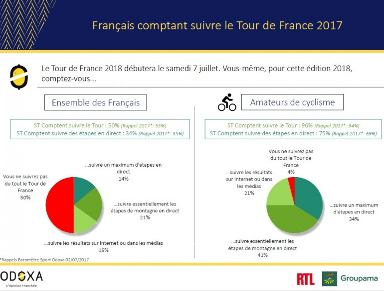 Un Français sur deux compte suivre, de près ou de loin, le Tour de France cycliste du samedi 7 au dimanche 29 juillet. Un Français sur trois croit à la victoire d'un coureur portant les couleurs bleu-blanc-rouge, sans doute Romain Bardet. Le Britannique Christopher Froome, dont la présence est majoritairement jugée anormale, est le grand favori pour 40% des sondés.