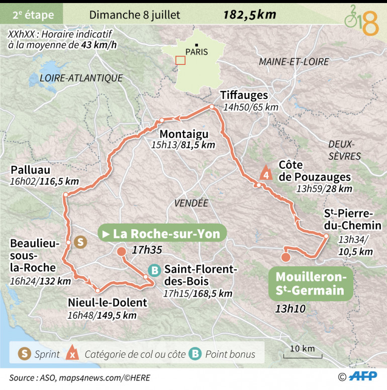 Le Tour de France 2018 continue son voyage en terre vendéenne lors de cette 2e étape longue de 182,5 km. Elle s'élance donc de Mouilleron-Saint-Germain, commune de moins de 2.000 habitants et se termine à La Roche-sur-Yon, la préfecture du département. Une seule difficulté répertoriée se trouve sur le parcours, dès le km 28 : la côte de Pouzauges (4e catégorie, 1 km de montée à 3,9% de moyenne).