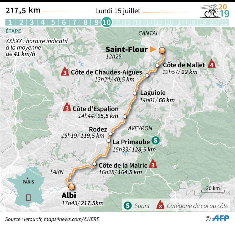 Ville-étape pour la 13e fois, Albi a consacré Peter Sagan, le Slovaque titulaire du maillot vert, lors de la dernière venue du Tour en 2013. Le final de l'étape, partie de Montpellier, empruntait un autre parcours. Départ fictif de Saint-Flour à 12h10, départ réel à 12h25. Arrivée à Albi prévue entre 17h28 et 17h59.