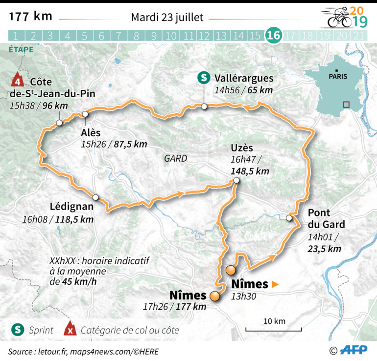 Cette 16e étape est assez courte (177 km) et ne présente qu'une difficulté répertoriée à mi-parcours, la côte de Saint-Jean-du-Pin (1,8 km à 4,2%), classée en 4e catégorie. Un sprint massif est probable à Nîmes, qui a déjà accueilli 17 arrivées du Tour, la dernière en 2014. C'est un sprinteur, le Norvégien Alexander Kristoff, qui s'était imposé.