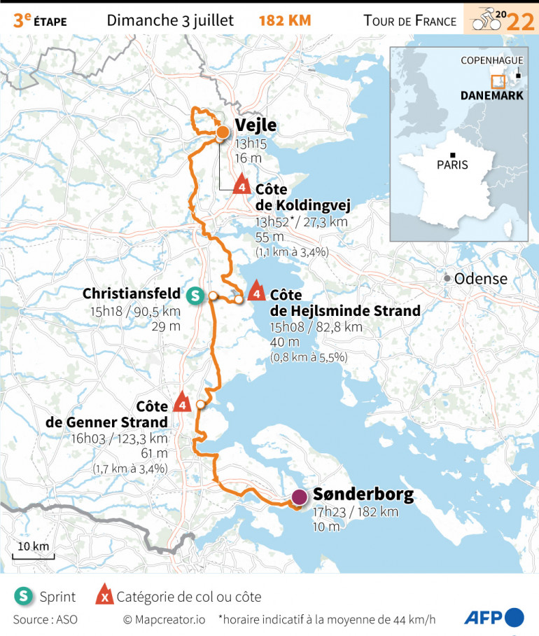 Trois petites côtes de quatrième catégorie sont échelonnées dans les deux premiers tiers du parcours de cette étape de plaine tracée dans le Syddanmark, le Danemark du sud, frontalier avec l'Allemagne. Départ de Vejle à 13h05 (lancé à 13h15), arrivée à Sönderborg vers 17h23 (prévision à 44 km/h de moyenne).