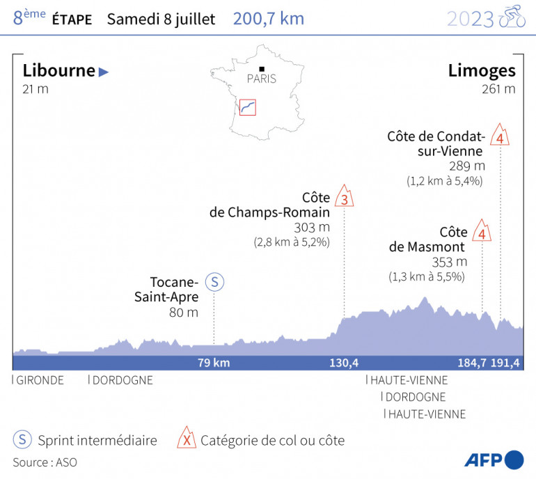 Le Tour de France poursuit sa remontée pour se rapprocher du Massif Central et du Puy de Dôme, avec dimanche 9 juillet une ascension hors catégorie en conclusion de la 9e étape qui fait saliver les suiveurs. Cette 8e étape entre Libourne et Limoges (200,7 km, le deuxième total le plus long de cette 110e édition) semble moins dure pour les organismes sur le papier. Son final de type accidenté est toutefois propice à la victoire d'un échappé.