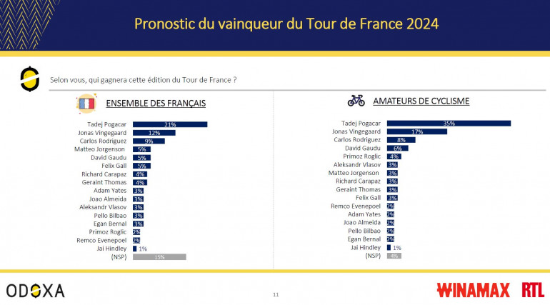 Du côté des candidats à la victoire finale à Nice le dimanche 21 juillet - et non pas à Paris en raison de l'imminence du début des Jeux Olympiques -, le Slovène Tadej Pogacar, double vainqueur en 2020 et 2021 et 2e des deux dernières éditions, devance largement le double tenant du titre, le Danois Jonas Vingegaard (21% contre 12% chez les Français, 35% contre 17% chez les amateurs de cyclisme). L'Espagnol; Carlos Rodriguez complète le podium (9% et 8%).