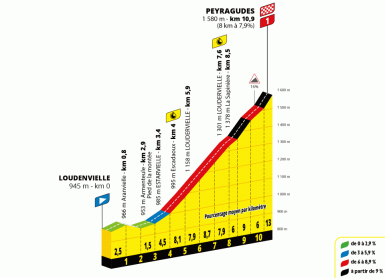 La montée à Peyragudes s’est bâtie une belle réputation et en particulier les derniers hectomètres qui donnent accès à l’altiport et éparpillent les favoris du Tour en plein effort. Toujours redoutable, l’ascension sèche ne pardonnera aucun temps mort en contre-la-montre. Les coureurs auront à peine deux kilomètres pour prendre leur élan et entrer dans la montée de Peyresourde, selon Christian Prudhomme.