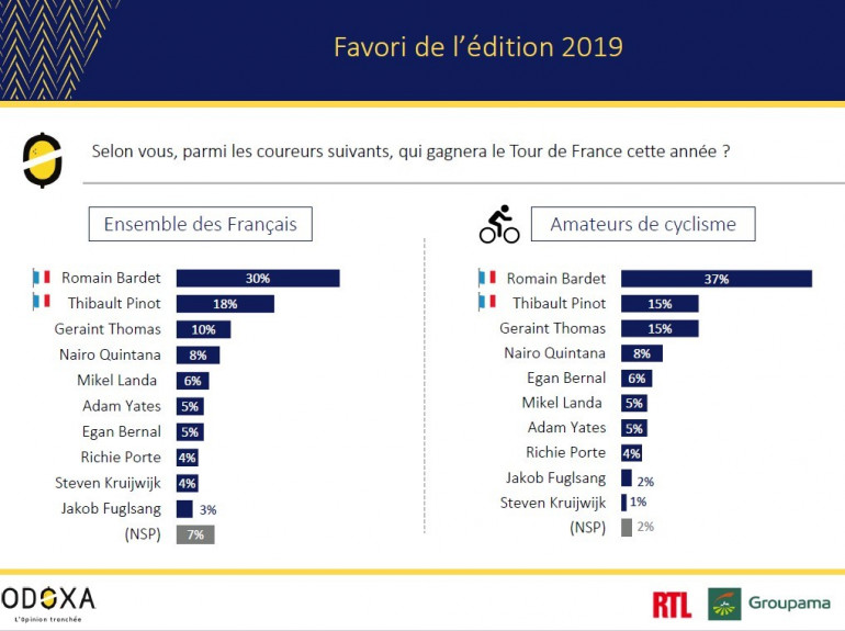 Les Français croient aux chances tricolores (63%) et placent Bardet et Pinot en tête des favoris. Après 34 ans de disette, et si c’était l’année ou jamais pour voir, enfin, un cycliste français sur la première marche du podium des Champs-Elysées ? En l’absence de Chris Froome et de Tom Dumoulin, ce sont des ultra-favoris (2ème et 3ème en 2018) qui laisseront plus de chances aux tricolores.