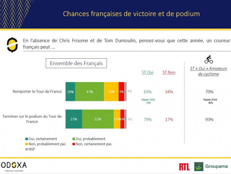 Les Français sont en tout cas très optimistes pour leurs cyclistes. L’an passé, ils étaient seulement 33% à y croire, ils sont désormais 63% à penser qu’un coureur français peut remporter le Tour de France cette année. Nos concitoyens pronostiquent aussi à 79% un podium.