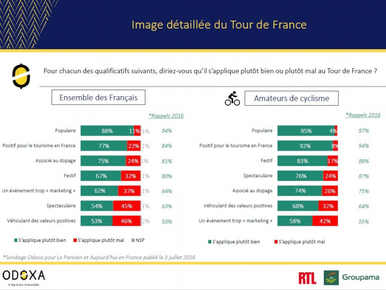 Populaire (88%), festif (67%), positif pour le tourisme (77%), le Tour de France est aussi toujours associé au dopage (75%) et perçu comme trop « marketing » (62%)