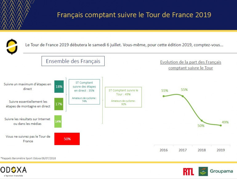 Dans le détail, 35% des Français regarderont des étapes en direct. La moitié d’entre eux en suivra le plus possible (18%) et l’autre moitié regardera essentiellement les étapes de montagne (17%).