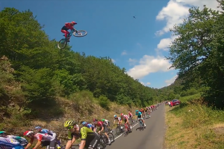 Depuis lundi, un cycliste fait beaucoup parler de lui sur le Tour de France. Sauf qu'il ne s'agit pas d'un coureur concourant sur la Grande Boucle, mais d'un vététiste pour le moins casse-cou. Le 15 juillet dernier, Valentin Anouilh a littéralement survolé le peloton à vélo, à environ 9 mètres du sol, lors de la 10ème étape entre Saint-Flour et Albi.