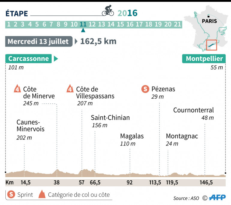 Le peloton se dirige tout doucement vers les Alpes. La 11e étape relie Carcassonne (Aude) à Montpellier (Hérault), ville-étape pour la 32e fois. 162,5 km et aucune difficulté majeure à signaler hormis deux côtes de quatrième catégorie en début de course. Le profil du parcours a tout pour plaire aux sprinteurs. La bataille pour le maillot vert, arraché par Peter Sagan ce mardi 12 juillet à Revel (Haute-Garonne), devrait reprendre ses droits : un sprint intermédiaire est prévu à Pézenas (km 49), la cité de Molière.