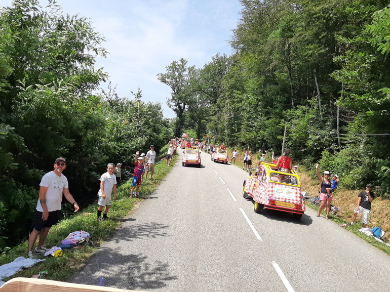 La caravane s’élance bien avant les coureurs : Il y a tout de même 150 véhicules ! Nous sommes sur la plus longue étape du Tour de France 2023 : 200 kilomètres à parcourir jusqu'à Limoges, le tout en lançant des petits sachets de saucissons et le fameux bob que les gens s’arrachent !
