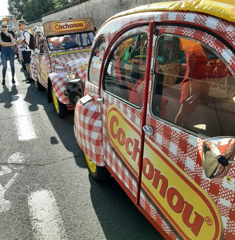 Concrètement, à 10h30, on est déjà en nage ! Je retrouve alors mon équipe : La Caravane Cochonou et son cortège de 2 CV motif Vichy. La marque est un partenaire historique. Cela fait 25 ans que ça dure !