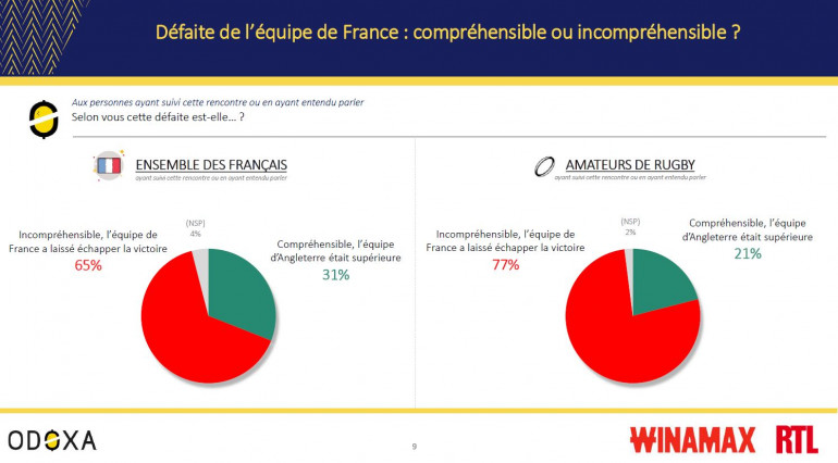 Parmi les personnes qui ont suivi le match Angleterre-France (victoire sur le fil du XV de la Rose 26-25), samedi 8 février dans le cadre de la 2e journée du Tournoi des 6 Nations, 65% des Français et 77% des amateurs de rugby jugent cette défaite "incompréhensible".