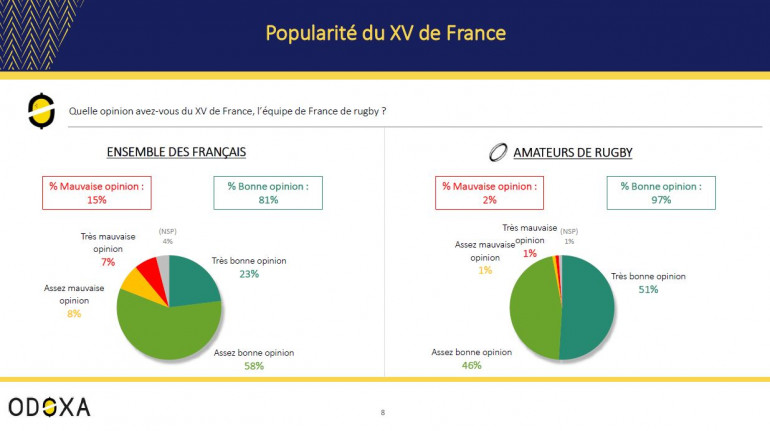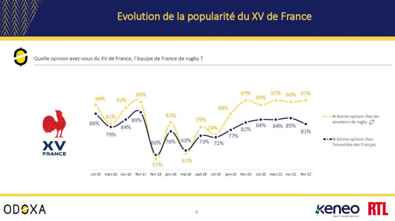Mais depuis la Coupe du monde 2019 et l’enchaînement de bons résultats, ponctués par la victoire face aux Blacks à l’automne, l’amour est de retour. Cela fait désormais deux ans que plus de 80% des Français et plus de 95% des amateurs de rugby ont une bonne opinion des Bleus. En ce mois de février 2022, 81% des Français et 97% des amateurs de rugby affirment avoir une bonne opinion du XV de France.