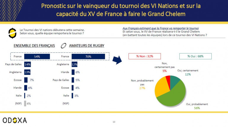 Aux yeux des Français et des amateurs de rugby, le grand favori du Tournoi des Six Nations est donc le XV de France. Ils sont respectivement 54% et 70% à le désigner comme futur vainqueur du tournoi. Le XV du Coq devance les tenants du titre gallois (14%), juste devant les Anglais (13%).