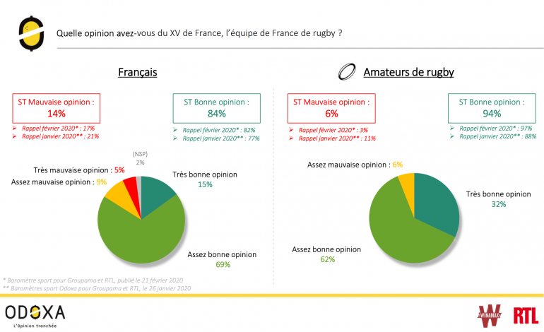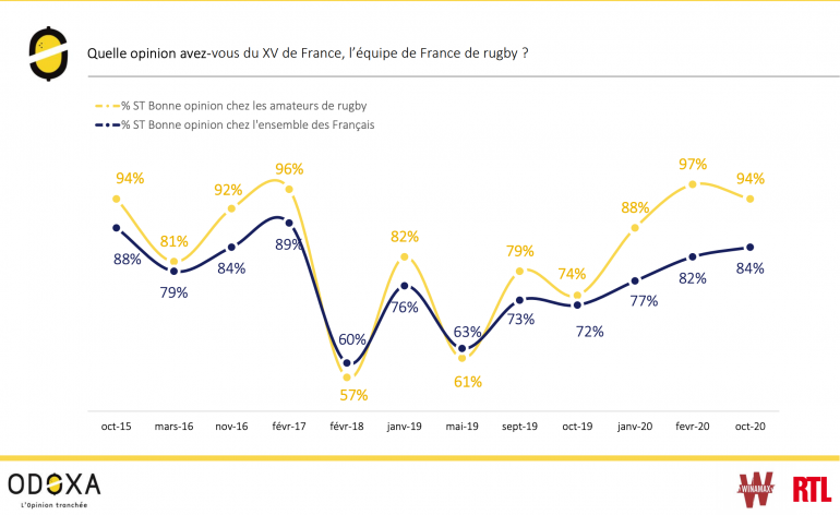 Conséquence sans doute, du très bon début de tournoi du XV de France en février et mars dernier, qui avait battu l'Angleterre, l'Italie et le pays de Galles, avant d'être ramené sur terre par l'Écosse. Stoppés dans leur élan par la pandémie, les Bleus peuvent finir sur une bonne note en cas de victoire face à l'Irlande samedi 31 octobre. Pour cela, ils peuvent compter sur le soutien des Français qui n'ont plus eu une aussi bonne opinion du XV de France depuis février 2017 (89%).