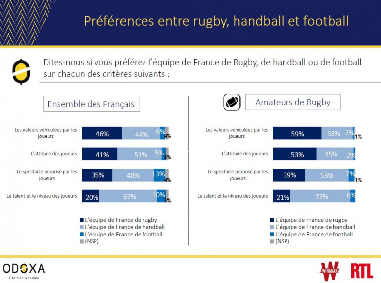 Les Français optent ainsi massivement pour les "Experts" en matière de talent et de niveau. 67% les préfèrent contre seulement 20% pour l’équipe de France de rugby et seulement 10% pour l’équipe de France de football. Ils préfèrent aussi leurs handballeurs sur la dimension du spectacle proposé : 48% contre 35% pour l’équipe de France de rugby et 13% pour celle de football.