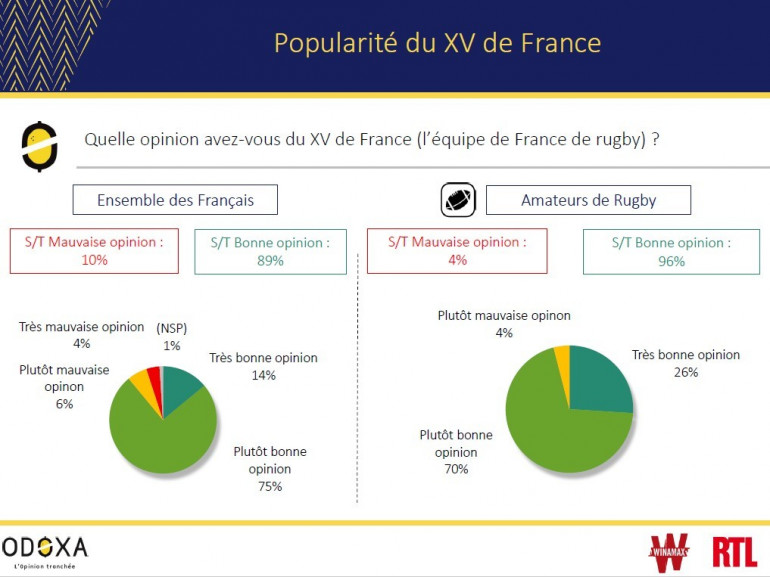 S'ils la moitié d'entre eux ne la croit pas capable de triompher le 18 mars prochain, les Français aiment leur équipe de France de rugby. 89% d’entre eux affirment en avoir une bonne opinion, une popularité qui s’élève même à 96% chez les amateurs de rugby.
