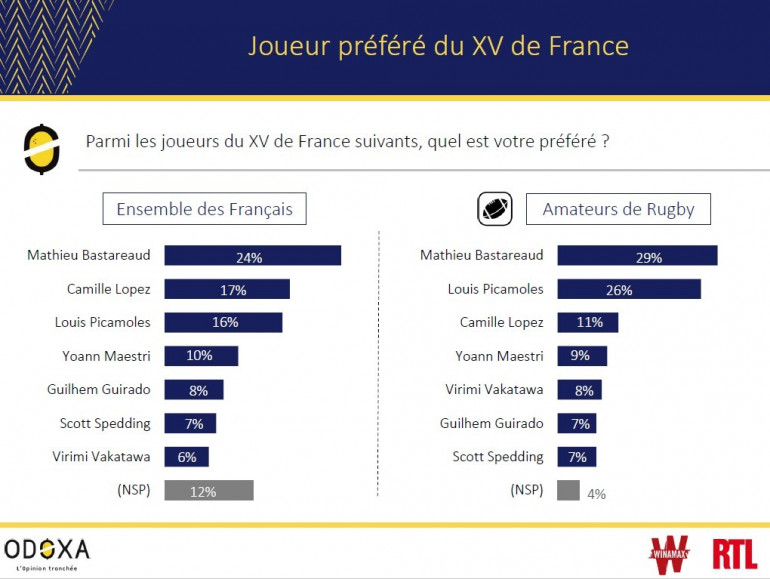 Chez les amateurs de rugby, le troisième ligne de Toulon arrive également en tête (29%), devant Picamoles (26%) et Lopez (11%). Le capitaine Guilhem Guirado n'arrive qu'en 6e position, derrière Yoann Maestri et Virimi Vakatawa.