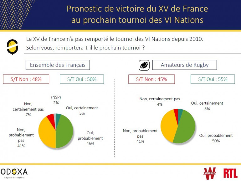 Dans le détail, 5% des sondés répondent "oui, certainement" à la question, 45% "oui, probablement". Chez les amateurs de rugby, l'ensemble grimpe à 55% avec 50% de "oui, probablement". 7% des Français ne croient absolument pas à la victoire finale à l'issue des cinq rencontres face à l'Angleterre, l'Irlande, l'Écosse, le Pays de Galles et l'Italie..