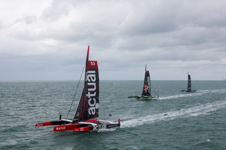 C’est à 14h10 que les 4 bateaux engagés dans la catégorie des maxi trimarans Ultim ont coupé la ligne du départ, un départ donné par l’astronaute Claudie Haigneré, la marraine de la course. C’est Anthony Marchand et Julien Villion sur Actual Ultim4 qui ont coupé la ligne en premier et qui ont vite fillé vers le large.