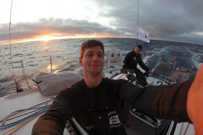 À 2.700 milles de l’arrivée, mardi 18 mai au matin, et à plus de 13 nœuds de moyenne, c’est le duo normand Alexis Loison-Guillaume Pirouelle ("Région Normandie") qui est en tête de la flotte devant Gildas Mahé et Tom Dolan ("Breizh Cola"). "On est en forme et en ligne droite vers La Palma, explique Guillaume Pirouelle. Les conditions sont musclées et il y a beaucoup de bruit à l’intérieur du bateau. Voilà pourquoi on porte nos casques anti-bruit".