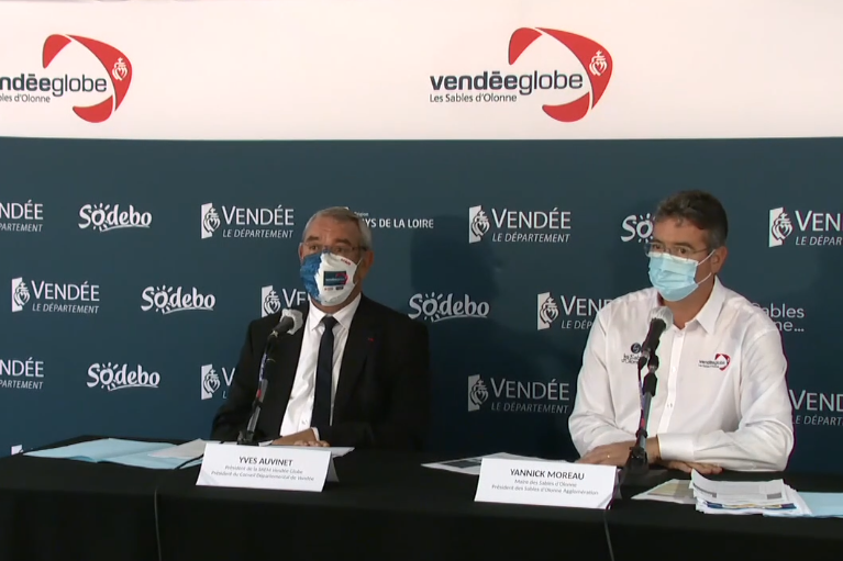 Yves Auvinet, président-organisateur du Vendée Globe, et Yannick Moreau, maire des Sables-d'Olonne, ont présenté les grandes lignes de la 9e édition du tour du monde en solitaire, sans escale et sans assistance, ainsi que le protocole sanitaire validé par l’État, mardi 6 octobre.