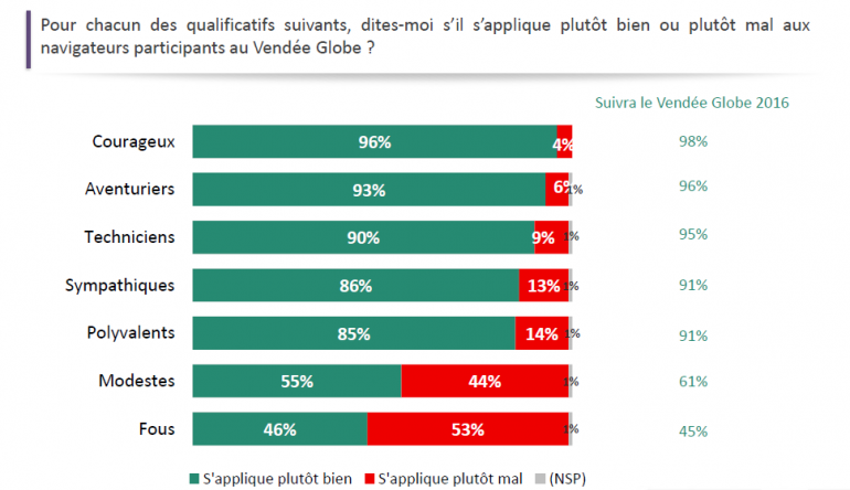 Enfin les skippers jouissent d'une belle cote auprès des Français qui voient en eux des héros des temps modernes. 96% des personnes interrogées les jugent courageux. Ils sont aussi polyvalents pour 85% des votants.