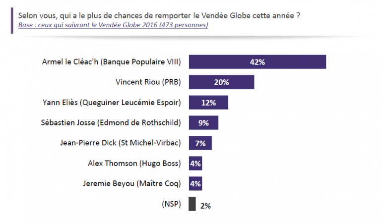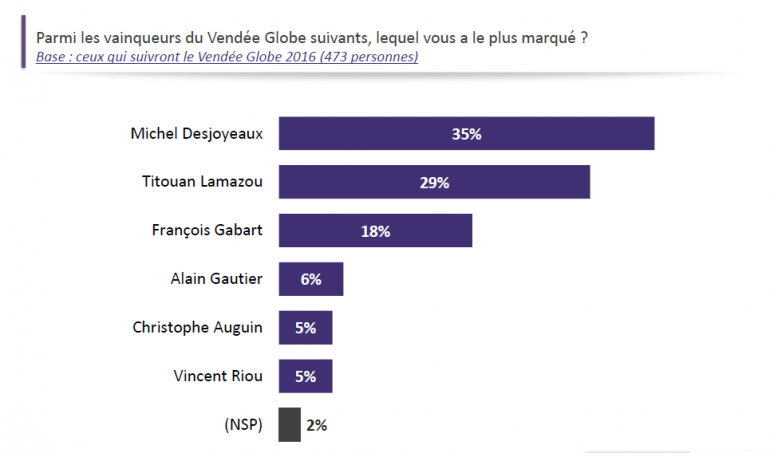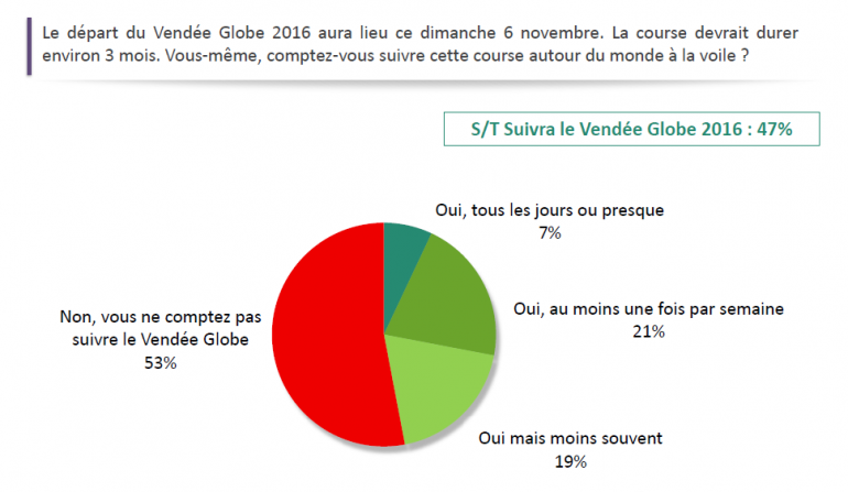 Sur 50 millions de personnes âgées de plus de 18 ans, ce sont plus de 23 millions qui surveilleront de près ou de loin les résultats de la course. L'intérêt porté au Vendée Globe varie selon les tranches d'âge. Ainsi, 25% des moins de 35 ans assurent qu'ils suivront la course contre 66% des 65 ans et plus. Le Vendée Globe est un rendez-vous incontournable pour beaucoup de Français. En 2016 aura lieu la 8e édition. Michel Desjoyaux, grand nom de ce sport, est celui qui a le plus marqué ceux qui suivent la course (35%). Suivent Titouan Lamazou, le vainqueur du premier Vendée Globe en 1989 (29%), puis le tenant du titre François Gabart (18%).