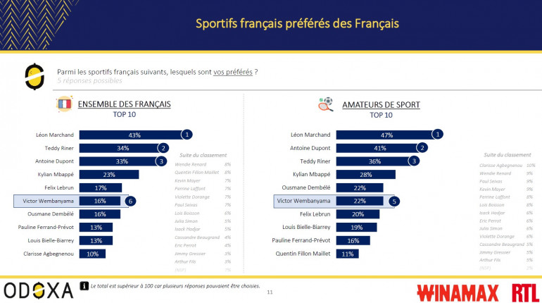 Les amateurs de NBA le voient d'ailleurs remplir son palmarès dès sa deuxième saison en NBA : 79% pensent qu’il sera désigné meilleur défenseur, 62% qu’il remportera le titre de MVP et 58% le titre avec les Spurs. Fort de son rayonnement sportif, Victor Wembanyama est aujourd’hui le 6e sportif préféré des Français derrière Léon Marchand, Teddy Riner, Antoine Dupont, Kylian Mbappé et Félix Lebrun, et figure même dans le top 5 des amateurs de sport.