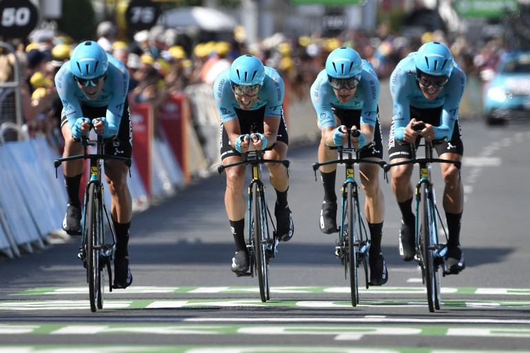 Quatre membres de l'équipe Astana sur le Tour de France le 9 juillet 2018 à Cholet