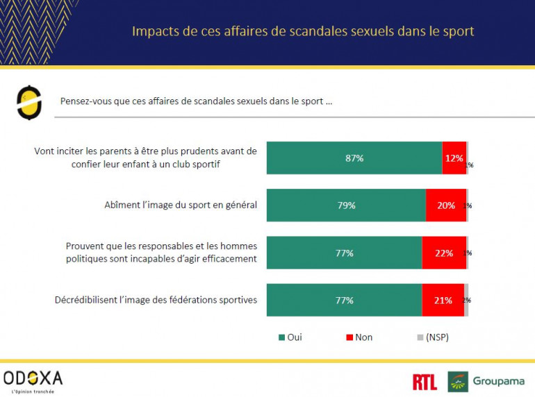 Pour 79% d’entre eux, ces affaires abîment l’image du sport en général. Il va surtout falloir prouver aux Français que des garde-fous sont mis en place si l’on souhaite éviter que les terrains soient désertés. Car pour 87% d’entre eux, ces affaires vont inciter les parents à être plus prudents avant de confier leur enfant à un club sportif.