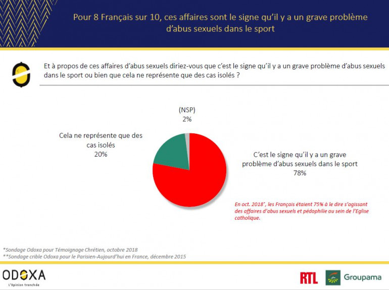 Plus grave encore pour le monde du sport, seulement 20% des sondés pensent qu'il s'agit pas cas isolés. La quasi-totalité des Français (78%) considère au contraire que c’est le signe qu’il y a un grave problème d’abus sexuels dans le sport. Les femmes le pensent encore plus que les hommes (83% contre 73%).