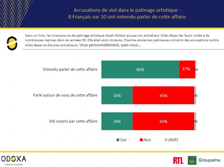 82% des Françaises et des Français ont entendu parler des accusations de viol de la patineuse Sarah Abitbol contre son ancien entraîneur Gilles Beyer et un tiers ont échangé sur le sujet ces derniers jours. 65% des sondés n'ont pas été surpris par ces révélations. 78% du grand public estime que c'est le signe qu'il y a un grave problème d'abus sexuels dans le sport.