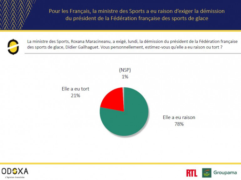 Très largement, les Français pensent que ces affaires abîment l'image du sport en général, prouvent que les responsables et les personnalités politiques sont incapables d'agir efficacement et décrédibilisent l'image des Fédérations sportives. Enfin, près de 8 Français sur 10 estiment que la ministre des Sports Roxana Maracineanu a eu raison de demander la démission de Didier Gailhaguet, le président de la Fédération des sports de glace.