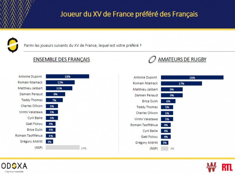 Dans ce duel, Romain Ntamack (12% et 17%) est préféré de peu à Matthieu Jalibert (11% et 9%). On retrouve ensuite les trois-quarts Damien Penaud (8% et 9%), Teddy Thomas (7% et 5%) et Brice Dulin (4% et 6%) ou encore le deuxième ligne Charles Ollivon (5%). Notons que, si certaines individualités émergent mais les Français apprécient surtout ce collectif.