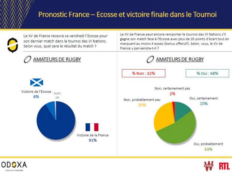 Les amateurs de rugby veulent y croire. Ils jugent l’exploit à la portée de cette équipe. 68% d’entre eux jugent en effet que le XV de France y parviendra, 15% en sont même certains. La tâche ne s’annonce pourtant pas aisée : l'Écosse s'est imposée en Angleterre (6-11) et ne s'est inclinée que d'un point face aux Gallois (24-25) de trois face aux Irlandais (24-27).