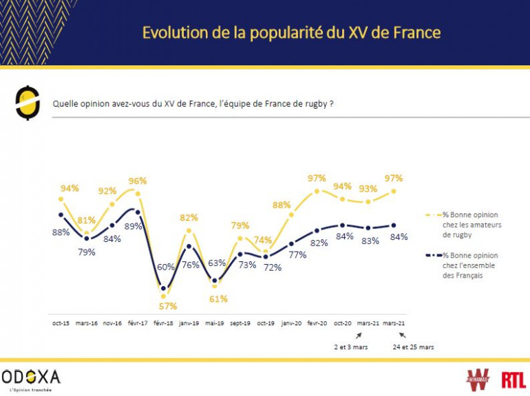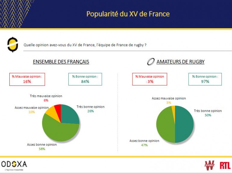La ferveur est telle que 74% des Français et 93% des amateurs de rugby affirment que les performances récentes du XV de France "font du bien et changent les idées dans la période que nous traversons". Selon eux, cette équipe envoie un "message positif de solidarité et de persévérance" (77% et 91%).