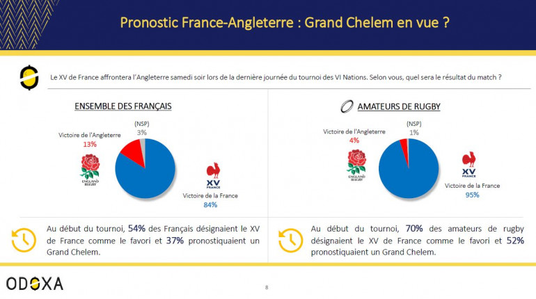Notons qu’avant le Tournoi, 54% des Français et 70% des amateurs de rugby désignaient le XV de France comme le favori et qu’ils étaient 37% et 52% à pronostiquer un Grand Chelem. En cas de défaite, la déception serait donc immense et la victoire finale dans le tournoi dépendrait des autres résultats.