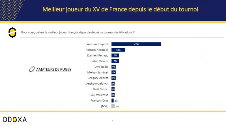 et porte cette équipe pétrie de talent. Sans surprise, les amateurs de rugby le désignent largement comme le meilleur joueur français du Tournoi (47%). Il devance son compère de la charnière Romain Ntamack, désigné par 13% des amateurs de rugby.