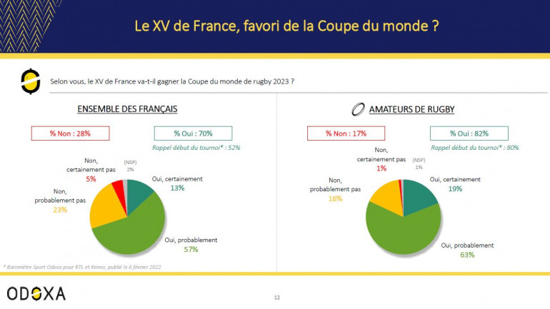 Les résultats du XV de France, porté par un Antoine Dupont désigné meilleur joueur par 47% des amateurs de rugby, lui permettent d’améliorer encore une popularité déjà au sommet : 86% des Français et 98% des amateurs de rugby en ont une bonne opinion. Mais surtout, le public commence à croire au titre mondial : 70% des Français et 82% pensent que le XV de France sera sacré en 2023.