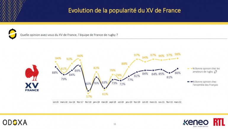 En ce mois de mars 2022, 86% des Français et 98% des amateurs de rugby déclarent avoir une bonne opinion du XV de France. Ils sont même respectivement 32% et 68% à en avoir