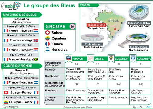 Infographie : composition du groupe E avec les adversaires de la France et les stades de la Coupe du monde où elle jouera la phase de groupe