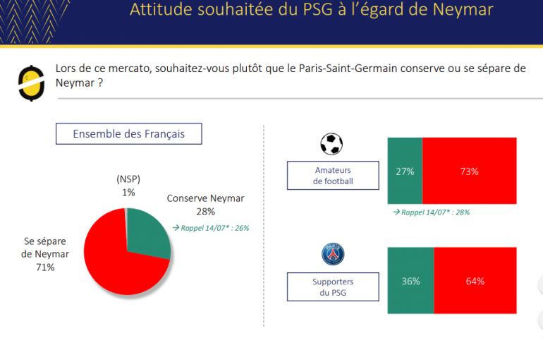 Le message est clair. 71% des Français souhaitent que le PSG se sépare de Neymar lors du mercato. Selon les résultats du baromètre sport Odoxa-Groupama-RTL de la semaine sur la L1 et sur ce mercato estival révélé ce samedi 24 août, le chiffre monte à 73% chez les amateurs de football.