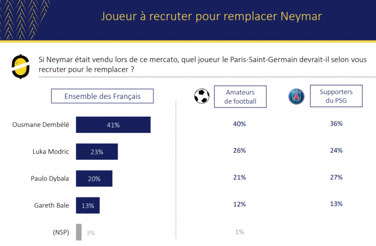 L'histoire d'amour entre Neymar et les supporters parisien semble bel et bien terminée. Interrogés sur le joueur que Paris devrait recruter pour pallier son éventuel départ, les Français (41%) et amateurs de football (40%) ainsi que les supporters parisiens (36%) souhaiteraient avant tout voir Ousmane Dembélé débarquer.