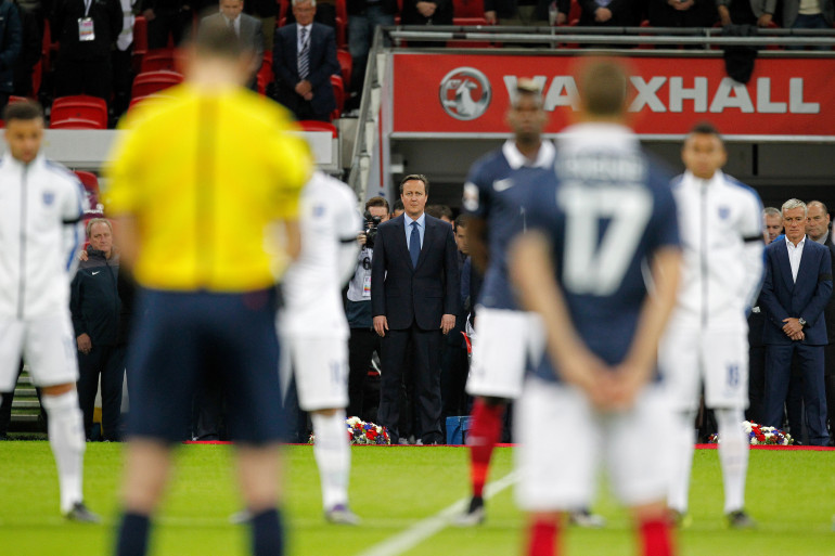 Les 22 joueurs se sont mélangés dans le rond central pour respecter une minute de silence avant la rencontre sous le regard de David Cameron