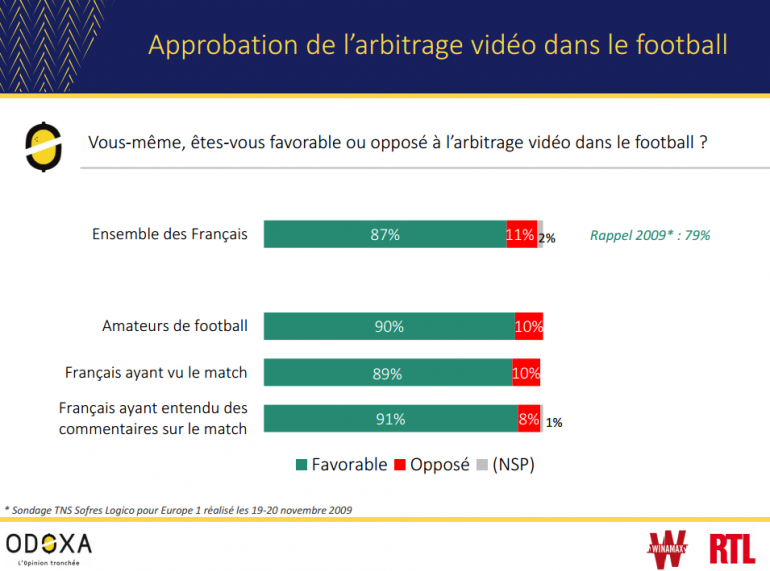 L'institut de sondage Odoxa a interrogé les "amateurs de football" sur leur approbation, ou non, de l'utilisation de la vidéo dans certains faits de jeu. Les résultats sont largement favorables pour la validité d'un but (93%), d'un penalty (91%), d'un hors-jeu sur action de but (90%), d'un carton rouge (85%) ou de l'identité d'un joueur à punir (80%). Les réponses sont moins catégoriques lorsqu'il s'agit de juger la sortie du ballon de l'aire de jeu (55%) ou une "faute sans carton" (50%).