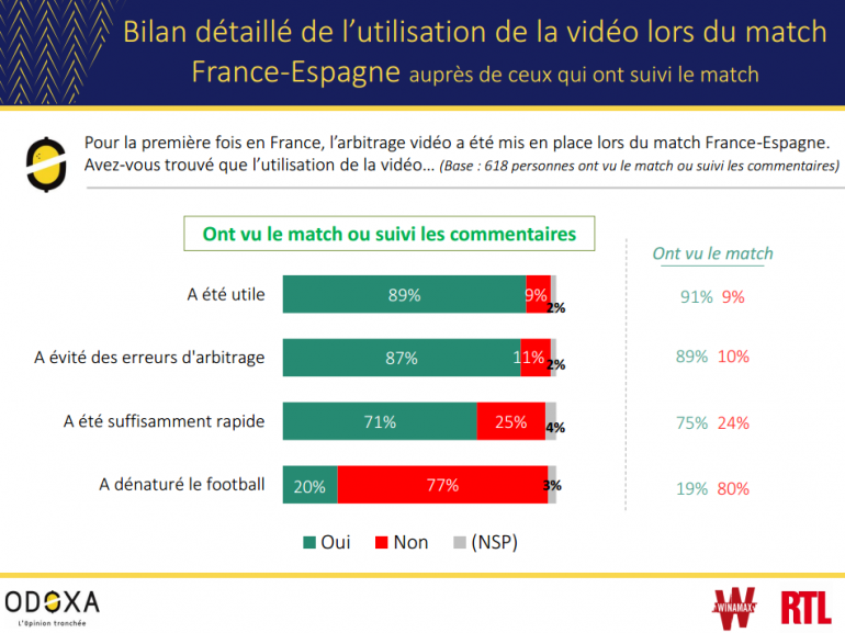L'institut de sondage Odoxa a questionné 1.019 personnes, toutes adultes, via Internet les mercredi 29 et jeudi 30 mars 2017. Leur a été demandées leurs avis sur l’arbitrage vidéo dans le football, leurs avis sur l'utilisation faite lors de France-Espagne et enfin quelles utilisations dans le futur.