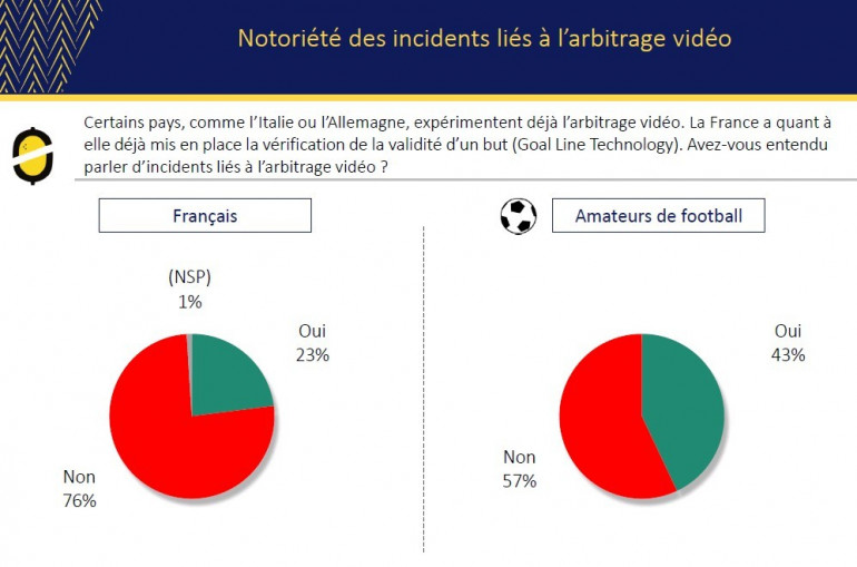 Les Français interrogés dans ce sondage l’ont été juste avant cette annonce. La part de ceux qui ont entendu parler d’incidents liés à l’arbitrage vidéo ou à la GLT est probablement plus élevée depuis, mais déjà, près d’un français sur quatre (23%) et 43% des amateurs de football déclaraient en avoir entendu parler.